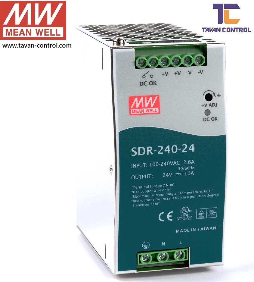 منبع تغذیه سوئیچینگ مین ول مدل SDR-240  یک منبع تغذیه خطی ریلی می باشد، که بر روی ریل های TS-35 / 7.5 یا TS-35/15 نصب می شود. این بدنه 63 میلیمتر عرض دارد، که امکان ذخیره فضا در داخل کابین را مهیا می کند. کل سری از ورودی کامل متناوب از VAC 88 تا VAC 264 و مطابق با EN61000-3-2، استاندارد اتحادیه اروپا برای جریان هارمونیک تنظیم می شود.